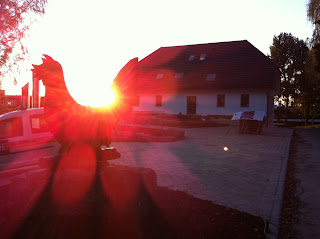 Wunderschöner Sonnenaufgang über dem neuen Warzeichen auf dem Berg. Ab 5.30 Uhr heute früh waren die ersten Elektriker am Werk, an allen Ecken und Enden wird gewerkelt!