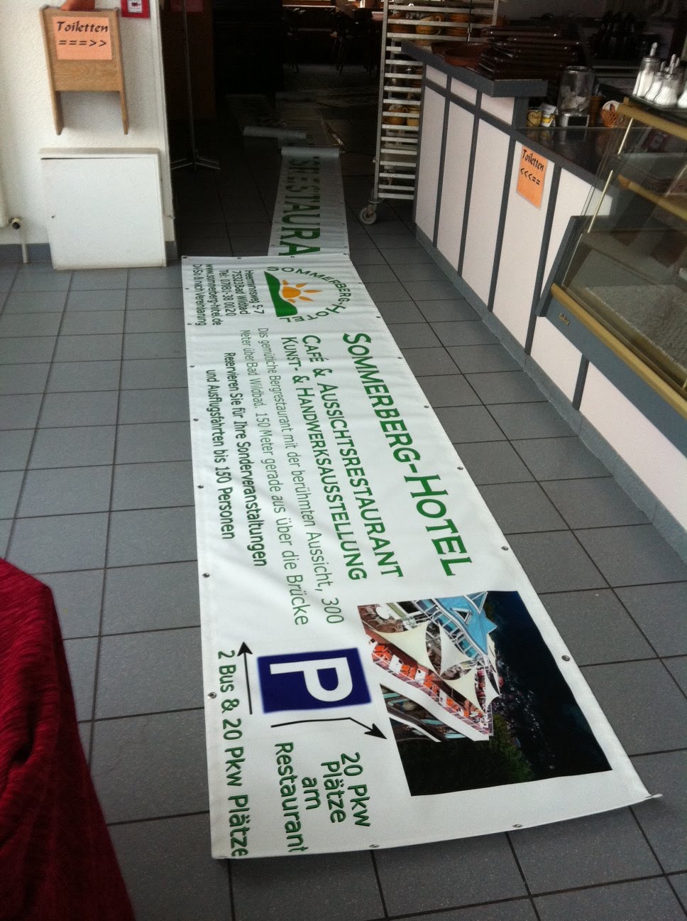 Wir pimpen das Geschäft mit neuer Werbung am Parkplatz, der Brücke und dem Aussichtsbalkon in Richtung Bergbahn.